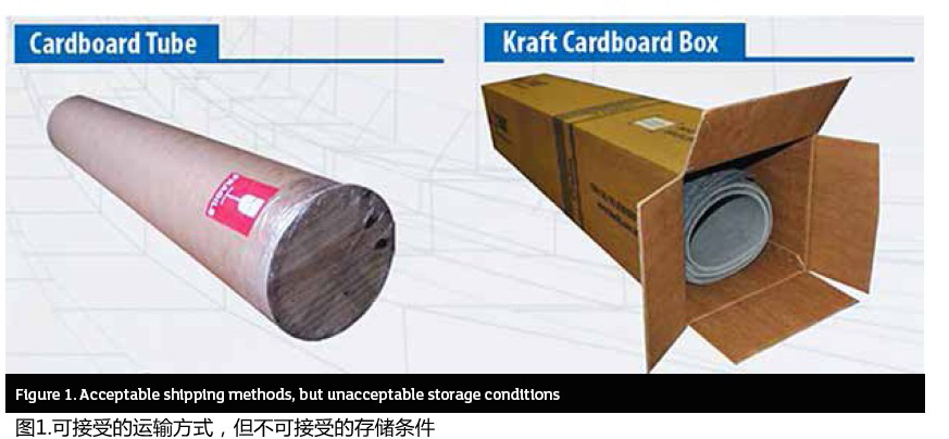 請注意,特別是對于彈性體粘合纖維片材,盡管盒子和紙管是經(jīng)批準的以卷材形式運輸片材的方法,但它們不應(yīng)在任何情況下用作長期存放(參見圖1)。