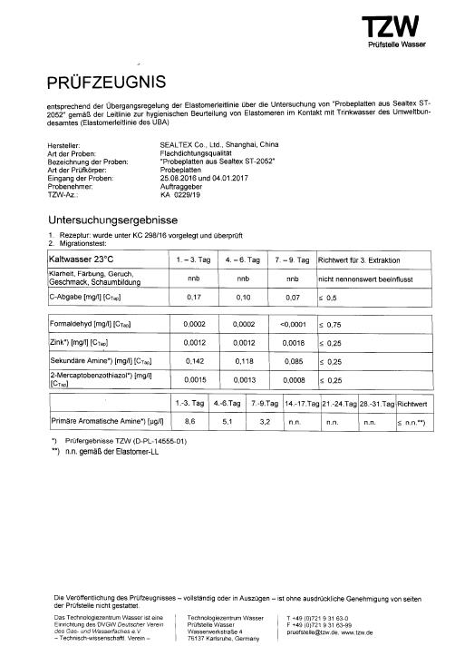 ST-2052無石棉墊片獲得飲用水認(rèn)證KTW,W270 我司ST-2052無石棉墊片于近日通過了歐洲D(zhuǎn)VGW機(jī)構(gòu)的認(rèn)可。獲得了歐洲飲用水方面認(rèn)證證書。 包括DVGW KTW,KTW W270。 ST-2052是一種通用型的無石棉環(huán)保密封墊片材料,可以應(yīng)用于多種工業(yè)環(huán)境。更多應(yīng)用可來電咨詢 KTW證書 W270證書 上一個(gè) 返回列表 下一個(gè)