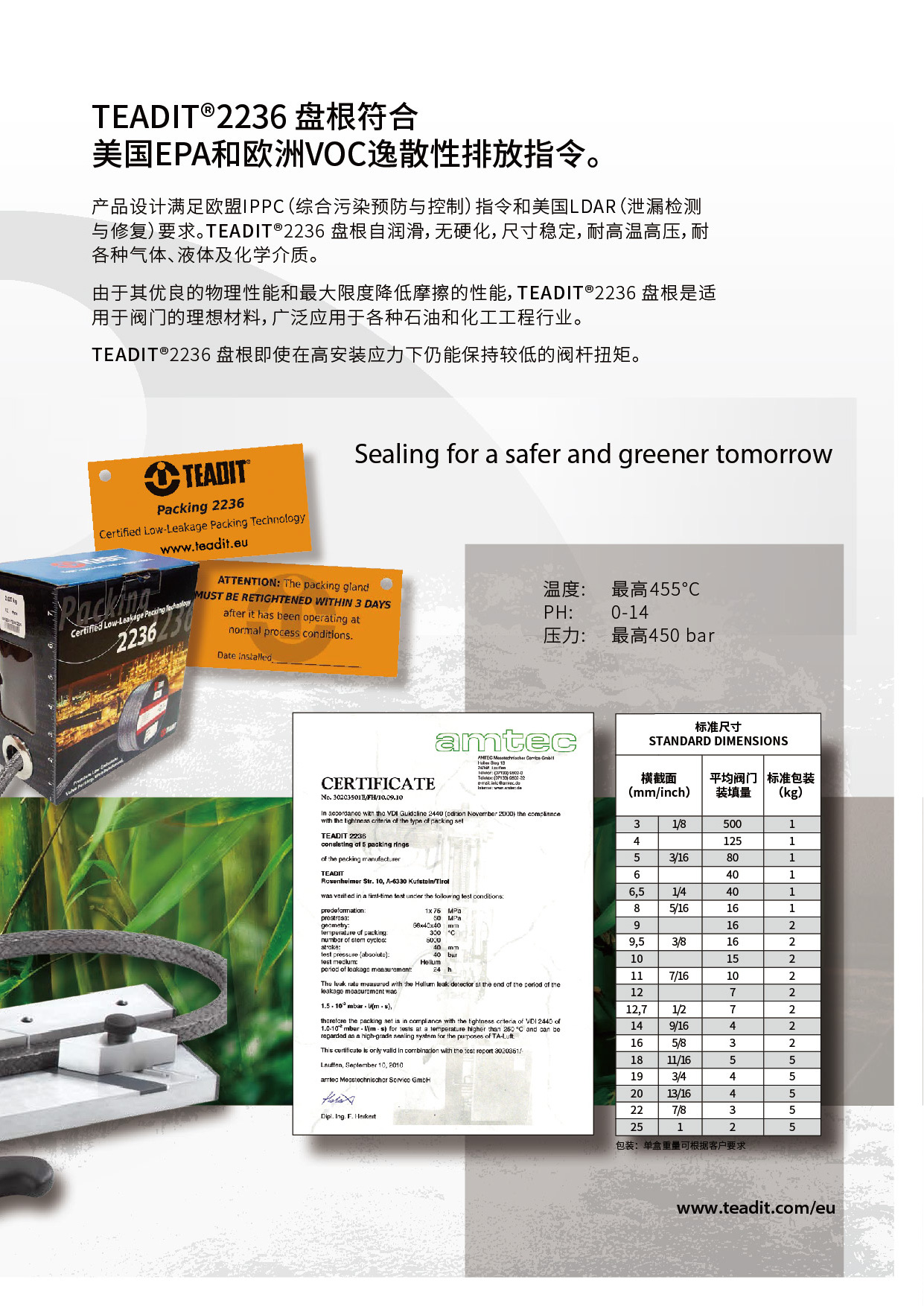 TEADIT® 2236 盤(pán)根具有自潤(rùn)滑、非硬化、尺寸穩(wěn)定、耐氣體和流體、耐熱、耐壓和耐化學(xué)腐蝕等特性。它的高溫柔性石墨和 Inconel® 長(zhǎng)絲護(hù)套具有機(jī)械穩(wěn)定性,先進(jìn)的結(jié)構(gòu)可在蒸汽服務(wù)中實(shí)現(xiàn)泄漏控制和高完整性。產(chǎn)品設(shè)計(jì)滿足歐盟IPPC(綜合污染預(yù)防與控制)指令和美國(guó)LDAR(泄漏檢測(cè)與修復(fù))要求。