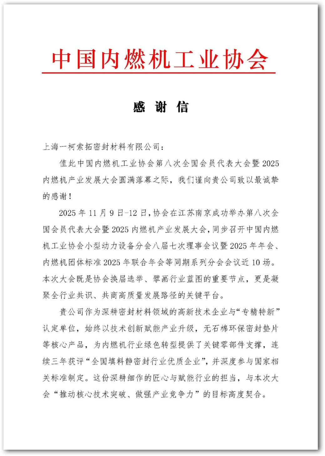 來自中國內(nèi)燃機(jī)工業(yè)協(xié)會(huì)的感謝信 近日,我司收到來自中國內(nèi)燃機(jī)工業(yè)協(xié)會(huì)的感謝信,也借此機(jī)會(huì)感謝協(xié)會(huì)的多年信任和支持,作為會(huì)員我們一直全力盡責(zé)盡職并很榮幸作為其中一員推動(dòng)協(xié)會(huì)和行業(yè)的發(fā)展。并再次祝賀大會(huì)的成功召開。 上一個(gè) 返回列表 下一個(gè)